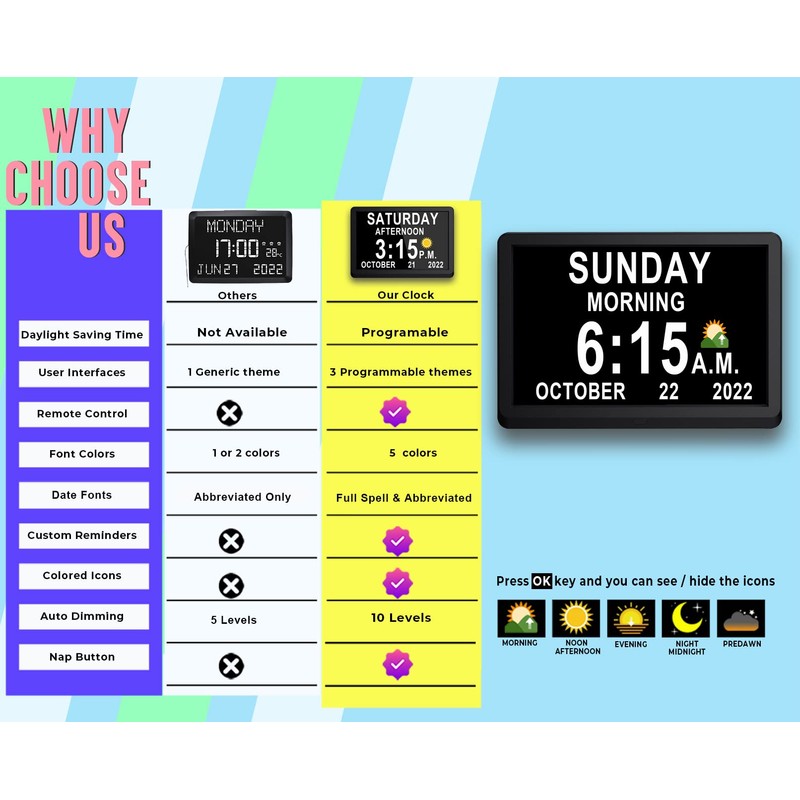 - ✔More Themes & Time Cycles: The digital clock comes with bright Sun/Moon icons which helps indicate the time and cycles during different periods of time. The clock can be Day-Month-Year or Month-Day- Year, 24 Hour military time or 12 Hour standard time with AM/PM. Clock can show or remove MORNING, NOON, AFTERNOON ,EVENING, NIGHT and BEFORE DAWN, reducing the time confusion.