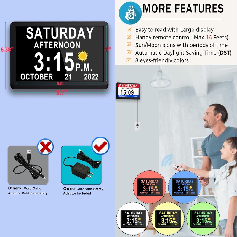 This 11.5 inch digital clock with date and Day of the week is purposedly developed to help the elderly people or school-age kids with trouble of reading regular clocks, visually impaired, Alzheimers' and Dementia; Or setting up reminders for them to accomplish their daily tasks.