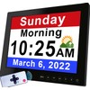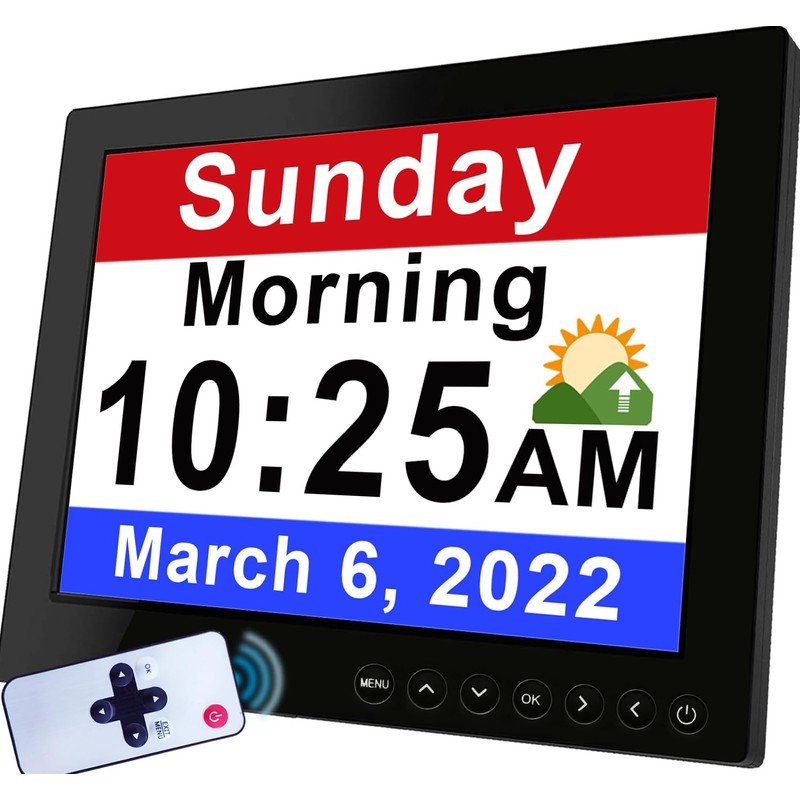 8-inch Memory Loss clock clearly spells out the full DAY of the WEEK, MONTH and DATE in large, bold letters with no confusing abbreviations. The large anti-glare screen allows you to easily read the time from any angle across a large room. Great clock for the Vision Impaired, Elderly and Memory Loss People.