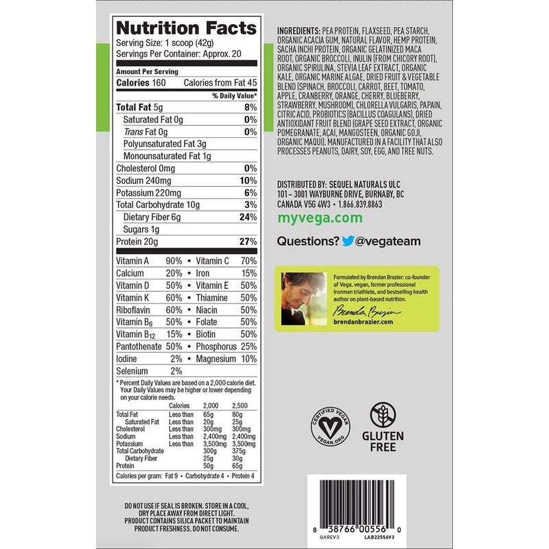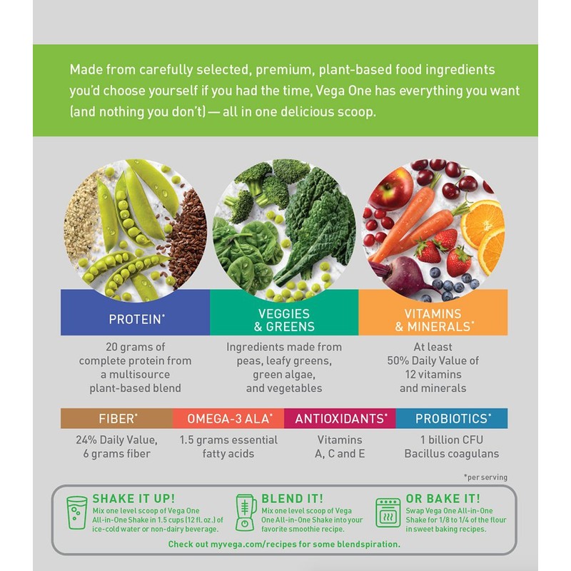 - All-in-one plant-based vegan protein powder made from real, whole food ingredients. Blend a serving of Vega One with your favorite fruit as a meal replacement