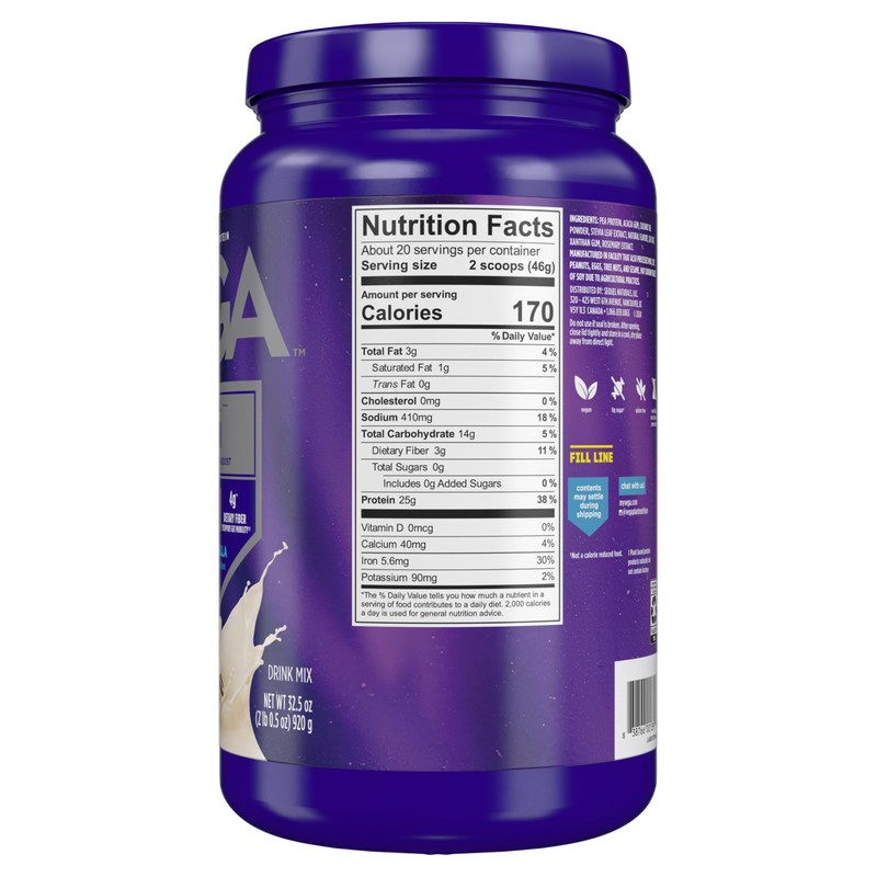 Get more of what matters with Vega Original Creamy Vanilla Plant Based Protein Powder. Vega protein powder is convenient, powerful plant-based nutrition, made for however you move your body. Each two-scoop serving provides 25 grams of protein exclusively from peas, versus the leading protein powder brand's 21 grams per serving. An excellent source of protein, this protein drink mix contains 3 grams of fiber per serving for 11% of your daily value and tastes great with 0 grams of sugar. This vanilla protein drink contains no unnecessary fillers or hard-to-pronounce ingredients, just clean, green fuel. Vega protein powder contains rosemary extract for a natural preservative that saves the taste and freshness without adding to the flavor profile. Vega Original Protein is not a meal replacement shake. Enjoy a vanilla protein shake with snacks, as part of a meal or take it with you on the go in a shaker bottle any time. Vega Original protein mixes seamlessly into water, milk or your favorite smoothie to create a great taste and rich, creamy texture; just scoop, shake and enjoy. Sip, smile and get stuff done with Vega Original Vanilla Protein Powder.