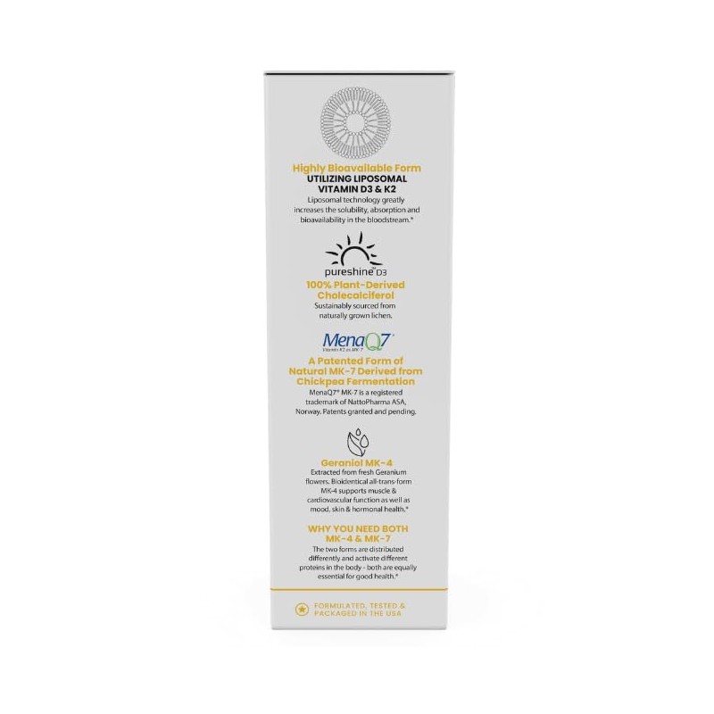 • NEW & IMPROVED LIPOSOMAL FORMULA: Our new formula utilizes 100% liposomal liquid Vitamin D3 & K2 for maximum absorption. You’ll notice it has a new golden color, and a light sunflower flavor and aroma. By making our formula liposomal, we were able to keep the serving size 5 drops and lower the amount of the MCT (carrier oil). This enabled us to reduce the size of the bottle and box to be more environmentally friendly while providing the SAME concentrated DAILY DOSE as before!