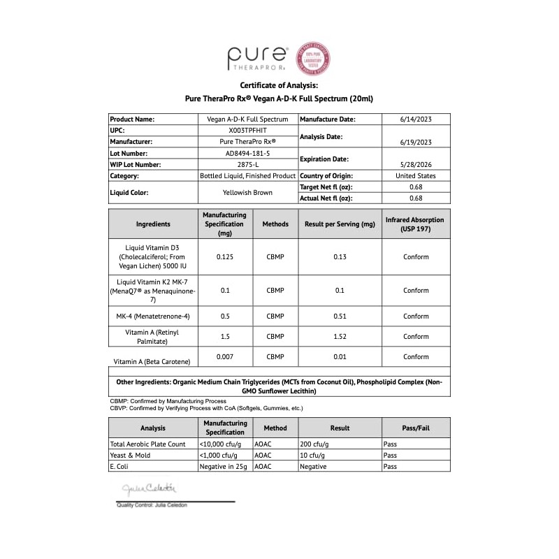 - GMP STRICT STANDARDS: Our Vegan A-D-K Full Spectrum is produced in a cGMP certified facility, meeting the most rigorous industry standards and guidelines. Our formula is constantly tested, ensuring the highest level of quality control. Our formula is Soy-Free, Gluten-Free, Alcohol-Free, Non-GMO, and offers natural LIPOSOMAL Vitamin D3 and K2 without animal by-products.