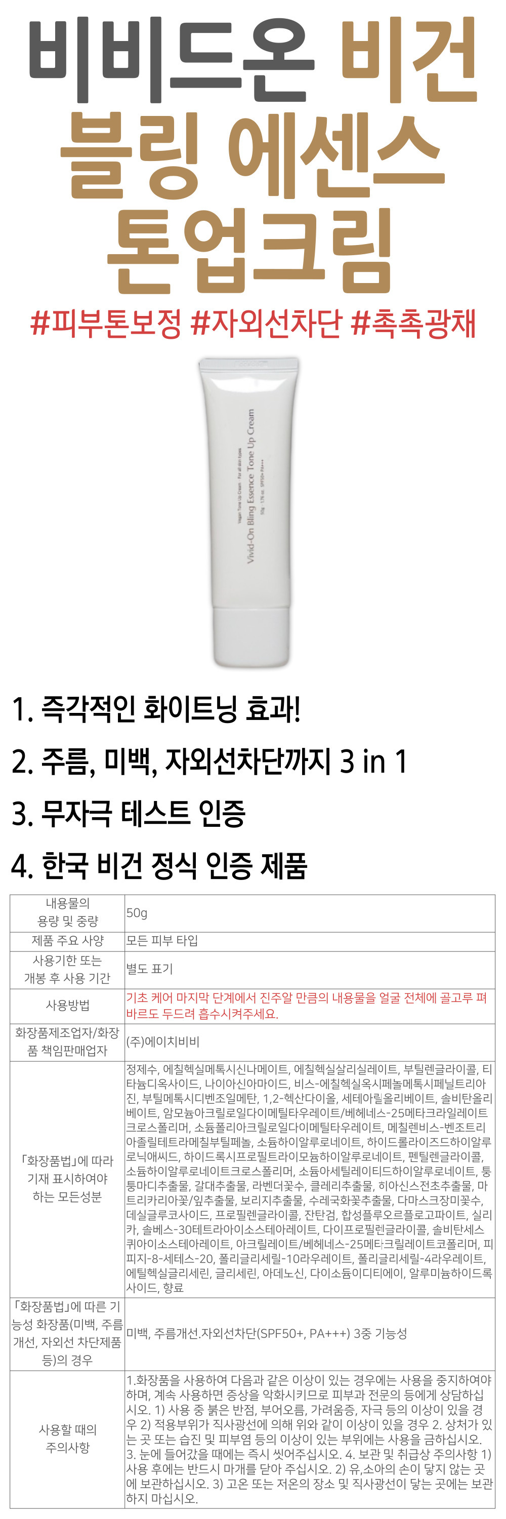 비건 화장품 비비드온 블링 에센스 톤업크림 무자극 메이크업 베이스 올인원 기능성 케어 피부 톤 결 스킨