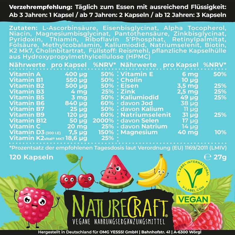 Vegan Kids Multivitamin - A+B1+B2+B3+B5+B6+B7+B9+B12+C+D3+K2+E