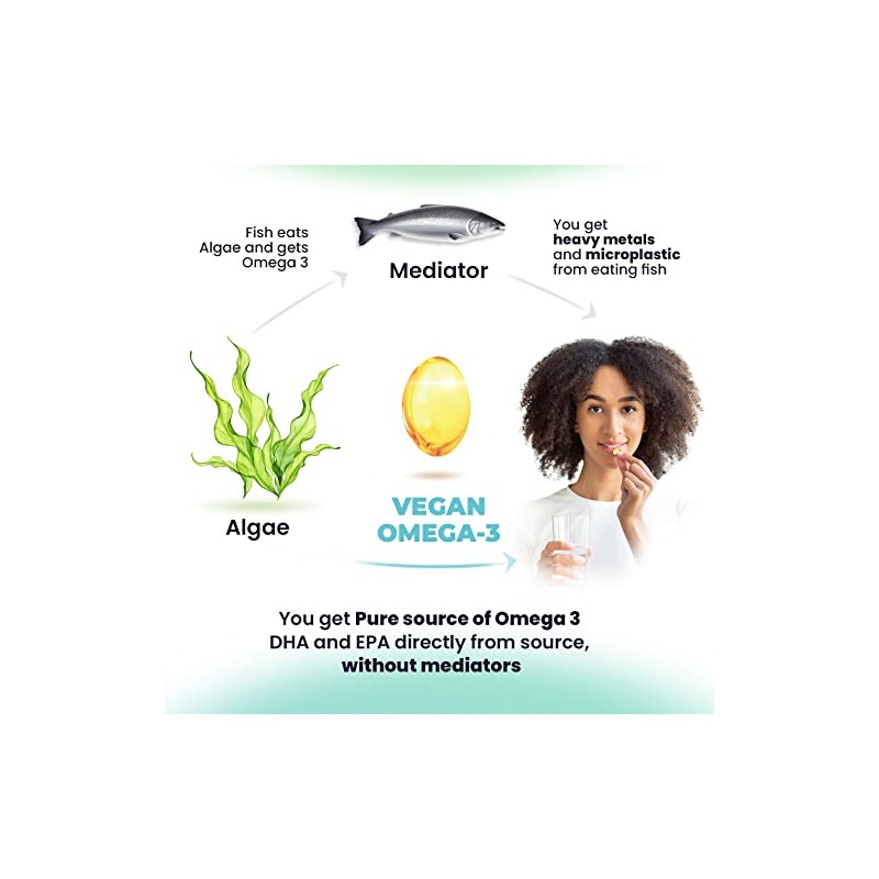 - . La fórmula vegana derivada de algas proporciona todos los beneficios del omega 3 directamente de la fuente sin sabor a pescado ni contaminación (mercurio, PCB, dioxinas) como en los aceites de pescado. Y se envasa en instalaciones registradas por la FDA con un riguroso control de calidad. El pescado no es en realidad la fuente de Omega, DHA y EPA. Los peces solo contienen omega 3 porque consumen microalgas. Al obtener estos aceites de un intermediario como el pescado, las personas también obtienen mercurio, metales pesados, microplásticos, etc. Nuestro producto proporciona Omega 3 de la fuente primaria: aceite de algas, excluyendo al pescado como intermediario. Cada cápsula vegetariana contiene: