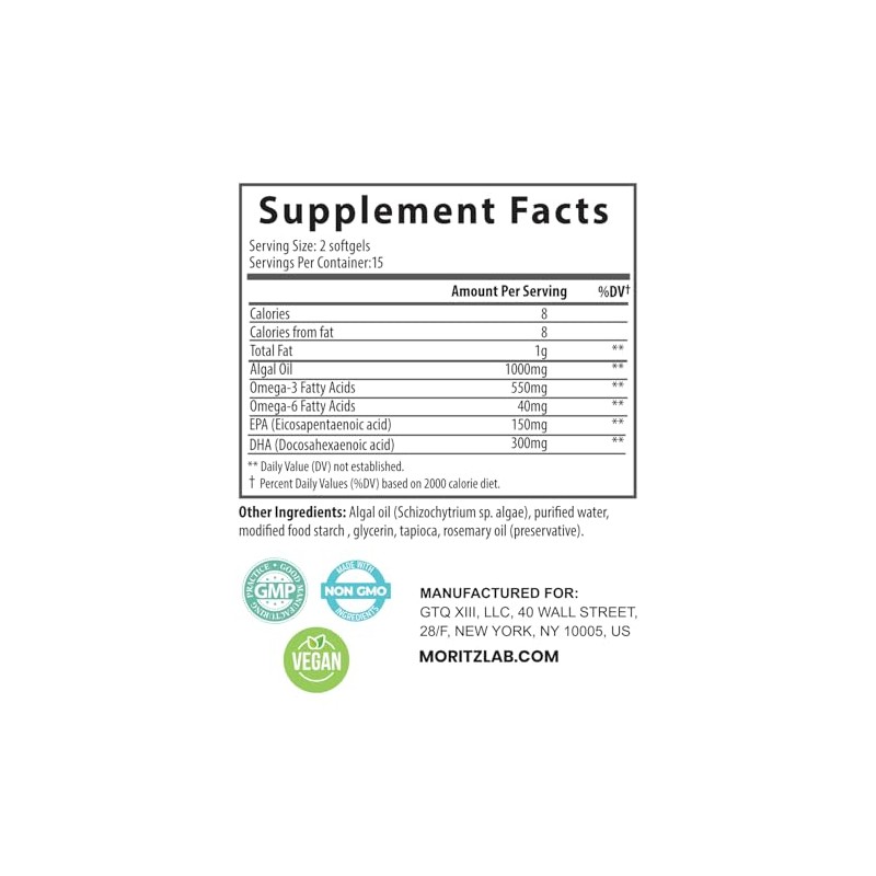 Las cápsulas de Omega 3, DHA y EPA de 1000 mg del Dr. Moritz proporcionan una dosis grande, pura y limpia de omega 3 para el cerebro, el corazón, los ojos, las articulaciones y el apoyo del sistema inmunológico*. La fórmula vegana derivada de algas proporciona todos los beneficios del omega 3 directamente de la fuente sin sabor a pescado ni contaminación (mercurio, PCB, dioxinas) como en los aceites de pescado. Y se envasa en instalaciones registradas por la FDA con un riguroso control de calidad. El pescado no es en realidad la fuente de Omega, DHA y EPA. Los peces solo contienen omega 3 porque consumen microalgas. Al obtener estos aceites de un intermediario como el pescado, las personas también obtienen mercurio, metales pesados, microplásticos, etc. Nuestro producto proporciona Omega 3 de la fuente primaria: aceite de algas, excluyendo al pescado como intermediario.