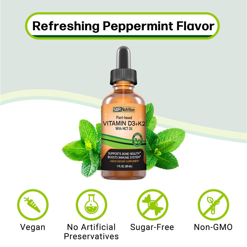 Vegan Vitamin D3 + K2 (MK-7) Liquid Drops with MCT Oil, Peppermint Flavor, Helps Support Strong Bones and Healthy Heart