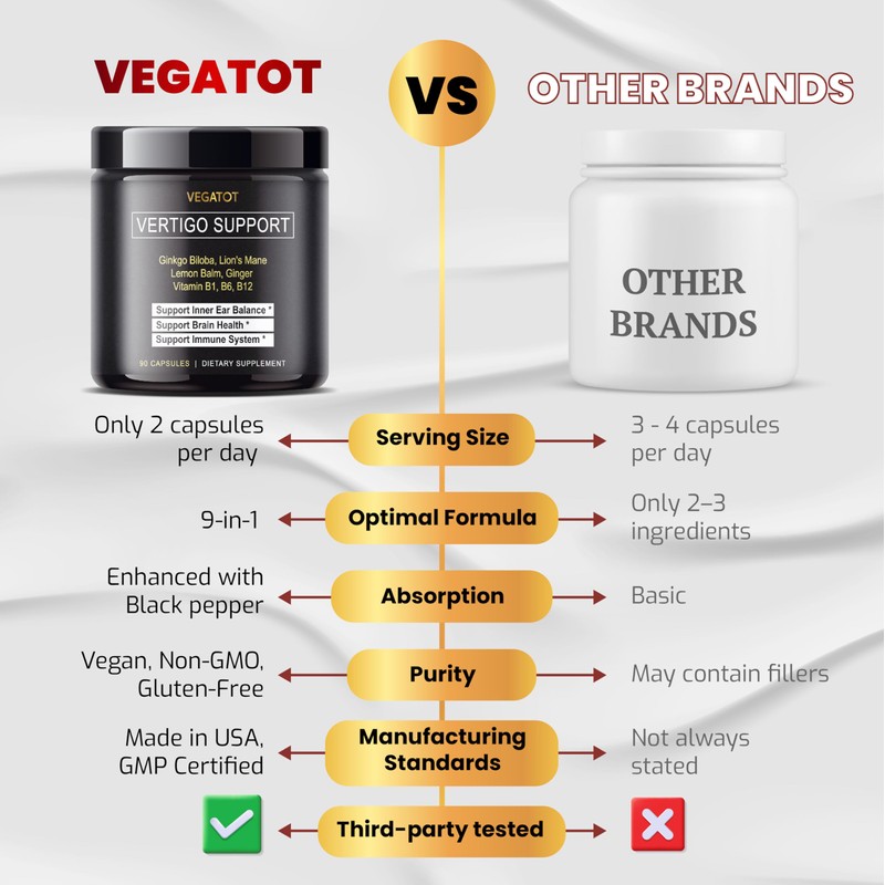 - : Vegatot Vertigo Support supplement combines 9 powerful ingredients, specially sellected for their unique beneficial properties. With our advanced complex, you no longer need to juggle multiple supplements. This all-natural vertigo supplement is perfect to comfort your vertigo.