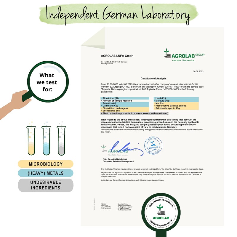 - ✔ HIGHLY DOSED: Our capsules contain 650 mg of triphala powder organic, providing a high dose of this beneficial supplement. Due to the laxative properties of triphala, higher doses are not recommended. Unlike many triphala tablets, our triphala antioxidant supplement is free from any additives, non-GMO and suitable for vegans. In one bottle: 180 capsules (3-month supply). Recommended dosage: 2 capsules per day.