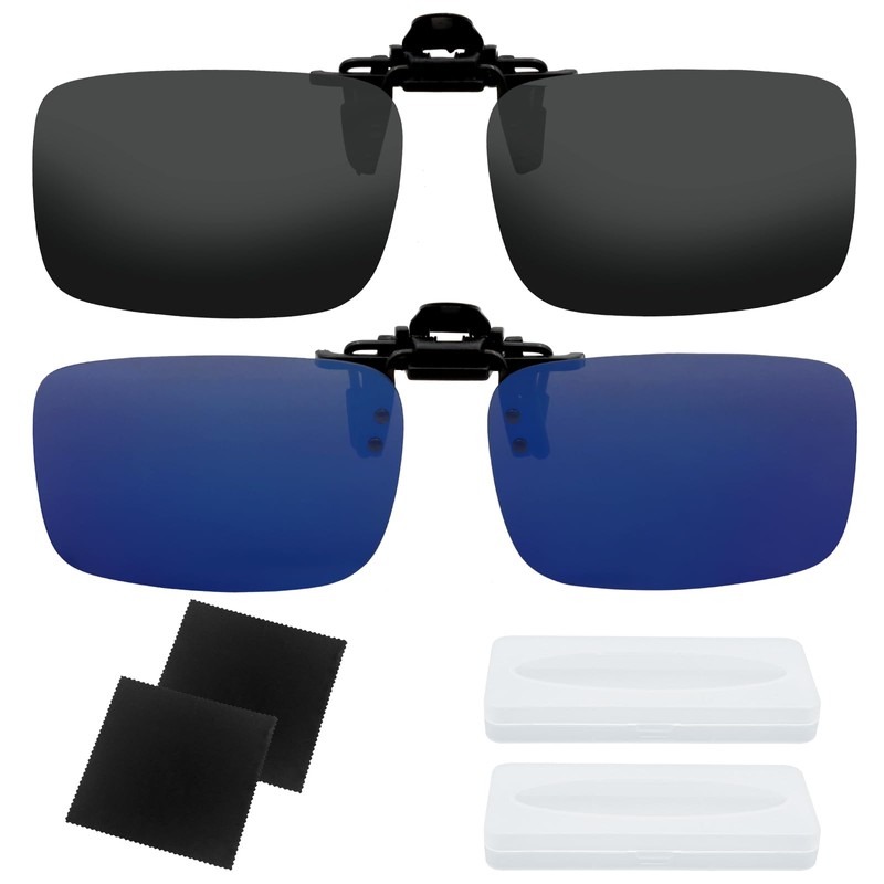 - What you will get: you will receive 2 pieces of differnet colour clip-on sunglasses: one is black grey and the other is dark blue, 2 pieces of white plastic storage boxes and 2 pieces of black glasses cloths.