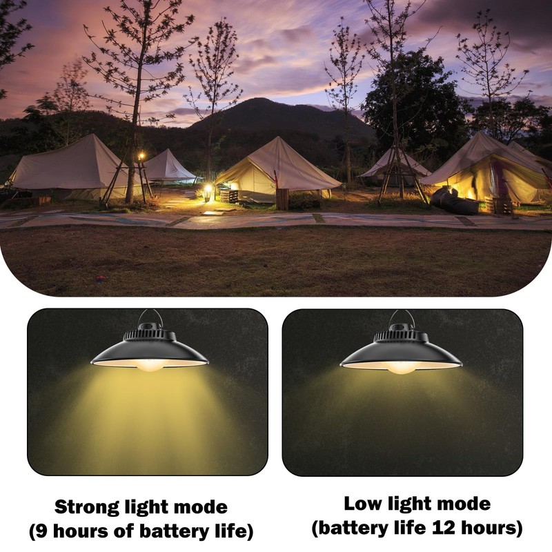 - ✔【2 Lighting Modes】: Press the switch of the camping lamp to light it up. Click to switch the light mode. There are two modes: strong light and low light.