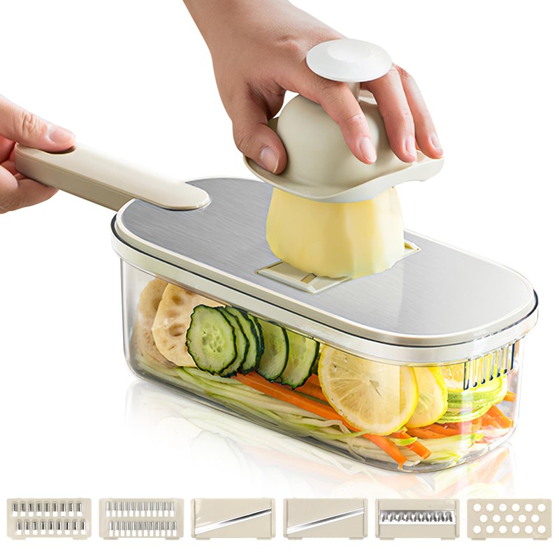 - Packing List: Our vegetable cutter is equipped with 6 interchangeable premium stainless steel blades, which offer a wide range of cutting options. This vegetable cutter for you to cut, grate, slice, dice or stick fruit, vegetables, fruits, herbs and nuts. Comes with a container and a hand guard.