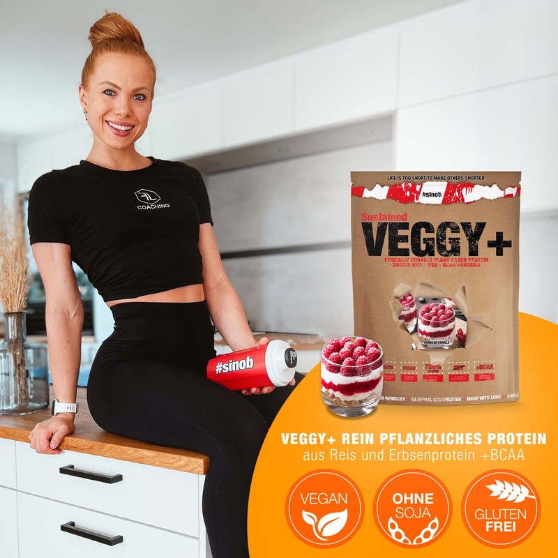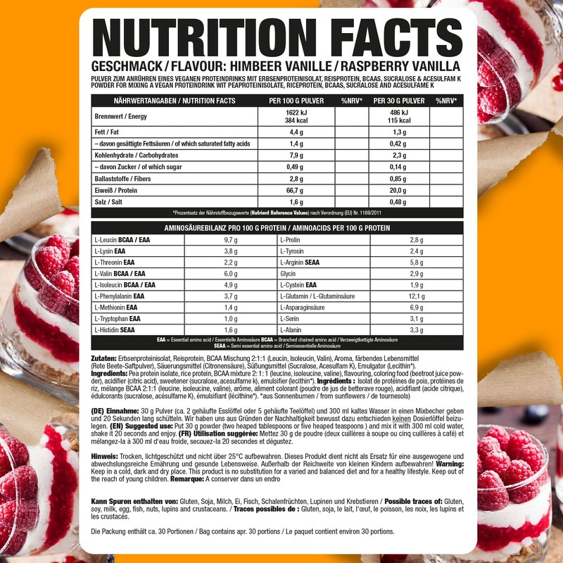 Veggy+ Vegan Protein Powder (Vanilla Raspberry) from Rice and Pea Protein Powder with Vegan BCAAs 1 x 900 g Protein Powder for Vegans Multi-Component Protein Powder 70% Protein