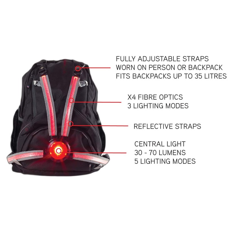 - Worn over shoulder without a backpack; Micro USB rechargeable
