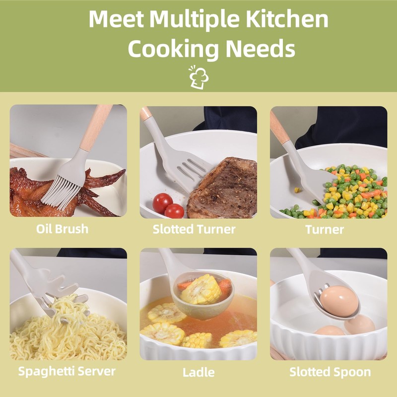 Vegoran Kitchen Utensils Set-34 Pcs,Silicone Cooking Utensils Set for Nonstick Cookware,446℉Heat Resistance Silicone Spatulas Set, Wood Handle-Kitchen Gadgets Tools (Khaki)