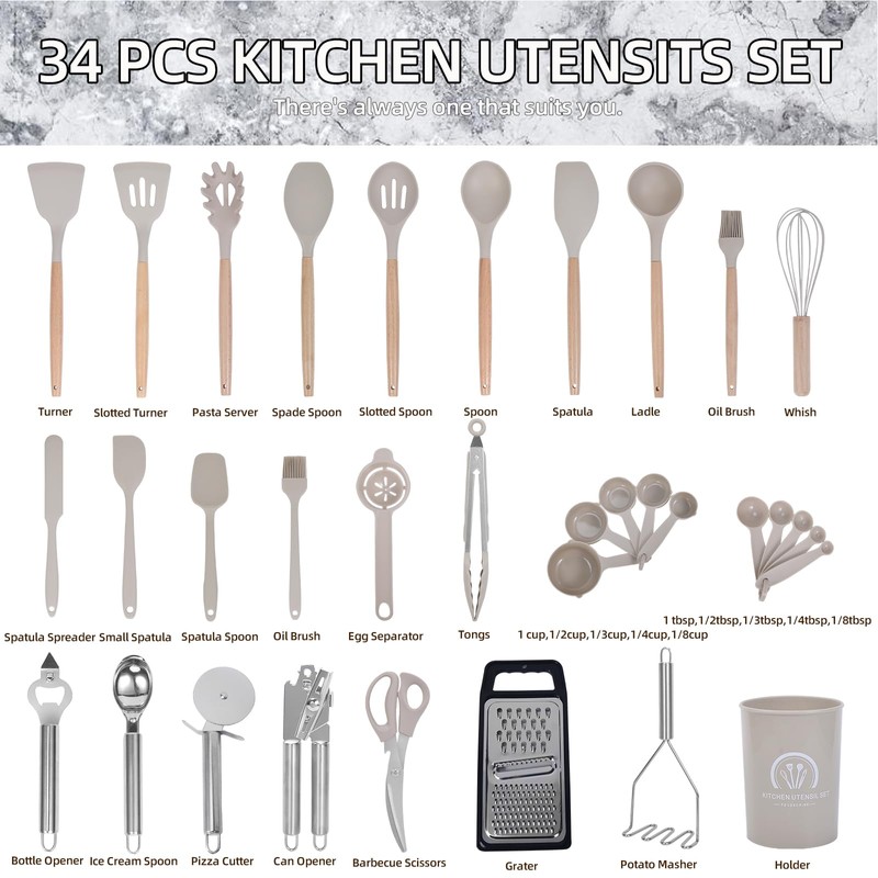 - ✅【34-PIECE KITCHEN UTENSIL SET】This utensil set includes all the utensils you need to cook the perfect dish, so you don't have to spend a fortune buying each utensil separately. Includes slotted spoons, spatulas, ladles, basting spatulas, oven kitchen tongs, scissors, ice cream scoops, pizza cutters and more. Almost everything you need in a kitchen is in one box.