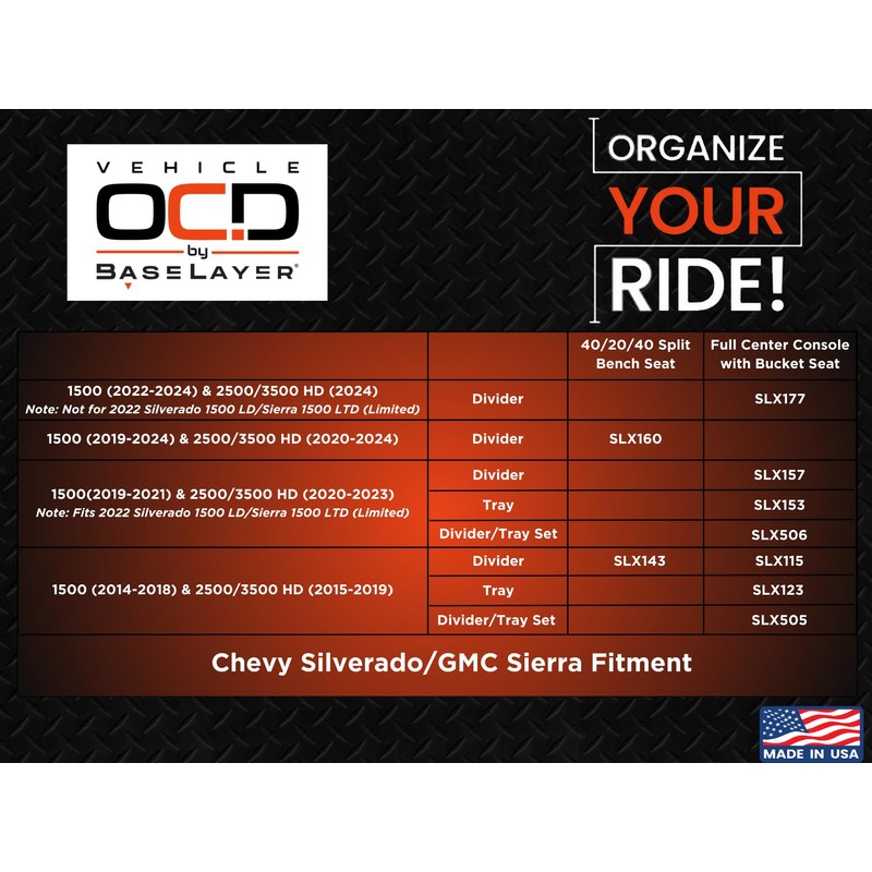 Vehicle OCD - Center Seat Console Organizer for Chevy Silverado 1500 / GMC Sierra 1500 (2019-2025) and 2500/3500 HD (2020-2025) (40/20/40 seat ONLY) - Made in USA - SLX160