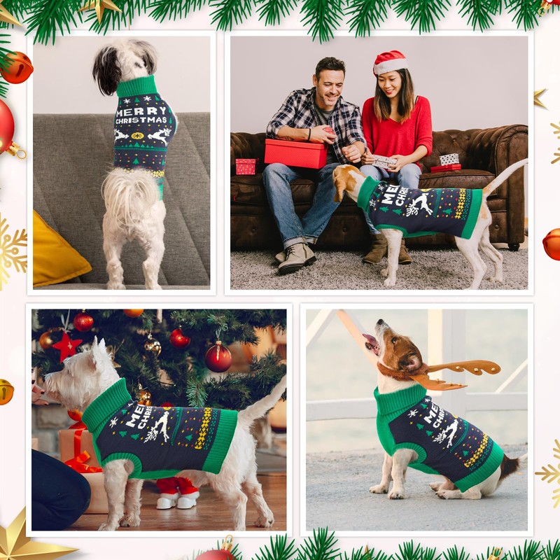 - 【Xmas Pet Sweater】The warm turtleneck puppy sweaters are specially designed for Christmas. The "Merry Christmas", two flying elks, snowflakes, Christms trees and bells on the back of the puppy clothes, add much atmosphere of festival. Dress your furry friends in the Christmas costume and let them partake in the festivities alongside you.