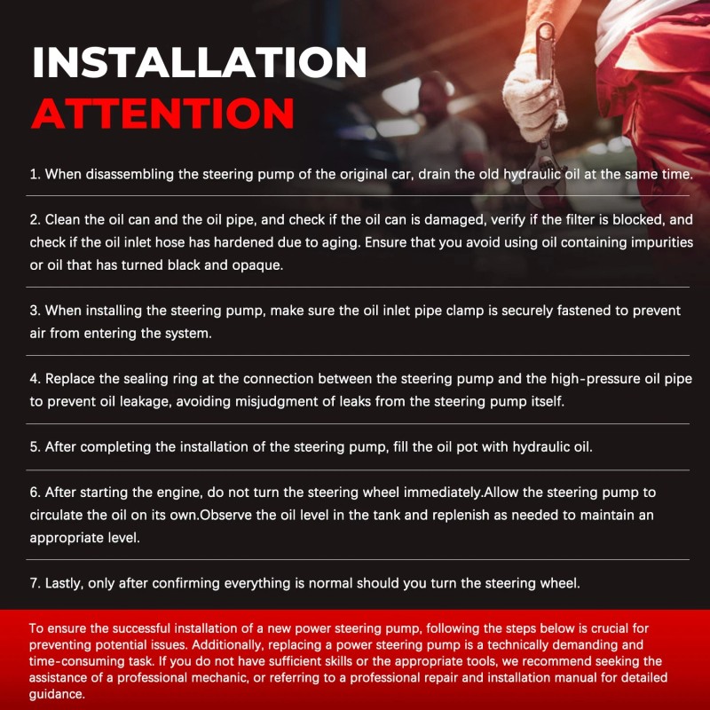 before installation, be sure to clean the oil pot and oil pipe. lfthere are impurities, after the car is running, the impurities inthe oil pot and oil pipe will enter the steering pump, resultingin the pump not working.
