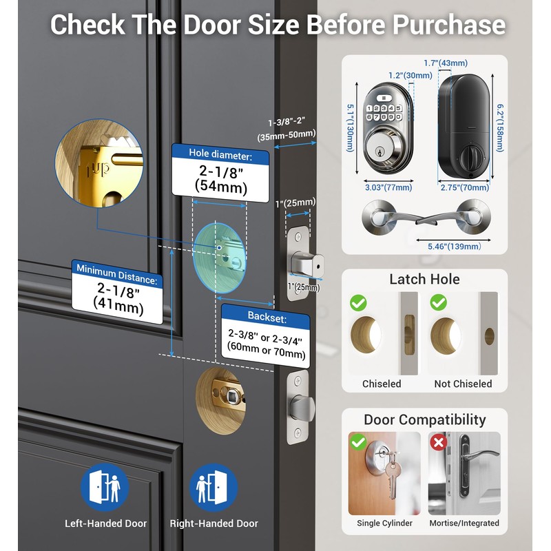 - Easy to Install: No extra drilling and costly locksmith required. Just with a screwdriver, the door lock will be easily installed and programmed all by youself. It's powered by 4 AA batteries, with adjustable latch in 2.36"(60mm) to 2.76"(70mm), applicable for the door thicknesses from 1.38"(35mm) to 2"(50mm) and the hole diameter in 2.13" (54mm).