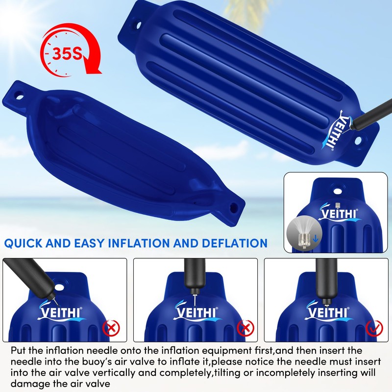 - 【What You Getting】Pack contains boat bumpers for docking 4 pack 8.5 x 27",4 pcs boat fenders rope (3/8" Dia x 5' L),4 inflating needles and a pump to inflate. marine bumpers for boats very handy to use and take only 35 seconds to inflate,note:avoid over-inflating. How do they deflate? You can just insert the included needle into the valve and squeezing the air out, then removing the needle, would do the trick. boat fenders bumpers easy storage, boat bumpers easy to install and take off