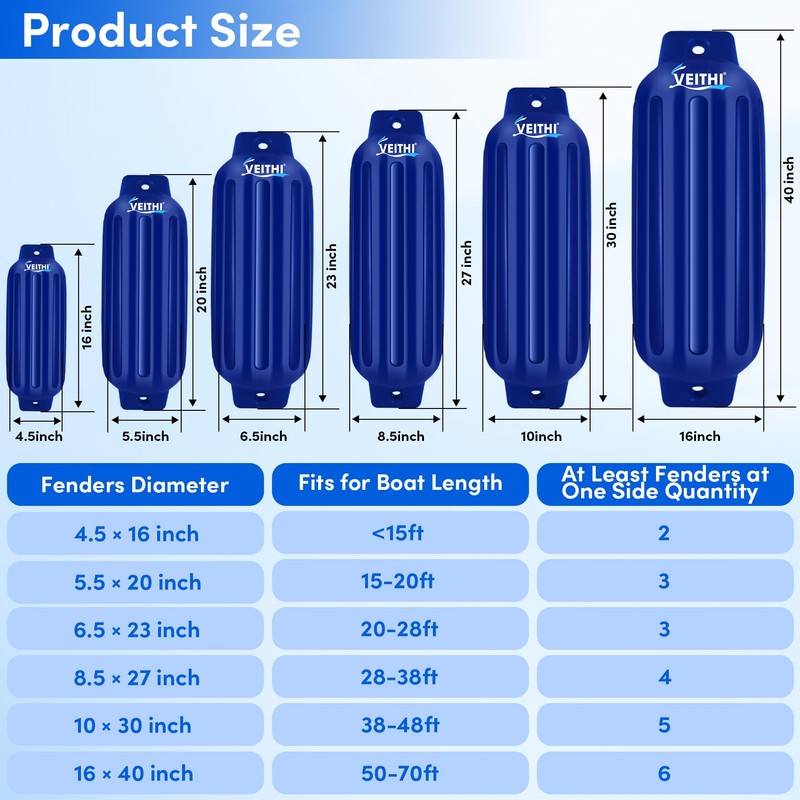 - 【How to Choose Size】These pontoon boat fenders bumpers six sizes available: 4.5 x 16 inch/5.5 x 20 inch/6.5 x 23 inch/8.5 x 27 inch/10 x 30 inch/16 x 40 inch,You can choose the right boat dock bumpers size according to your needs. for boats 20 to 28 ft, the 6.5-inch boat bumper is recommended, and for boats between 28 - 38 ft, 8.5-inch boat fenders for boat is ideal, and for boat with a length of 38 to 48 ft, it is recommended to use 10-inch boat bumpers fenders large