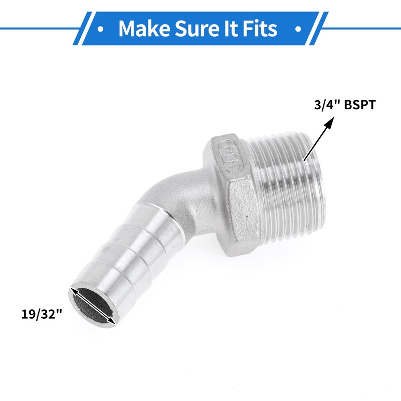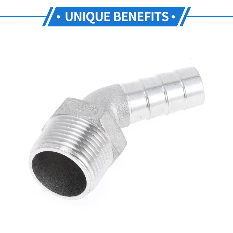 VekAuto 304 Stainless Steel Hose Barb Fittings 19/32" OD 3/4" BSPT 45 Degree Elbow Joint for Air Water Oil Gas Fuel 2 Pcs Silver Tone