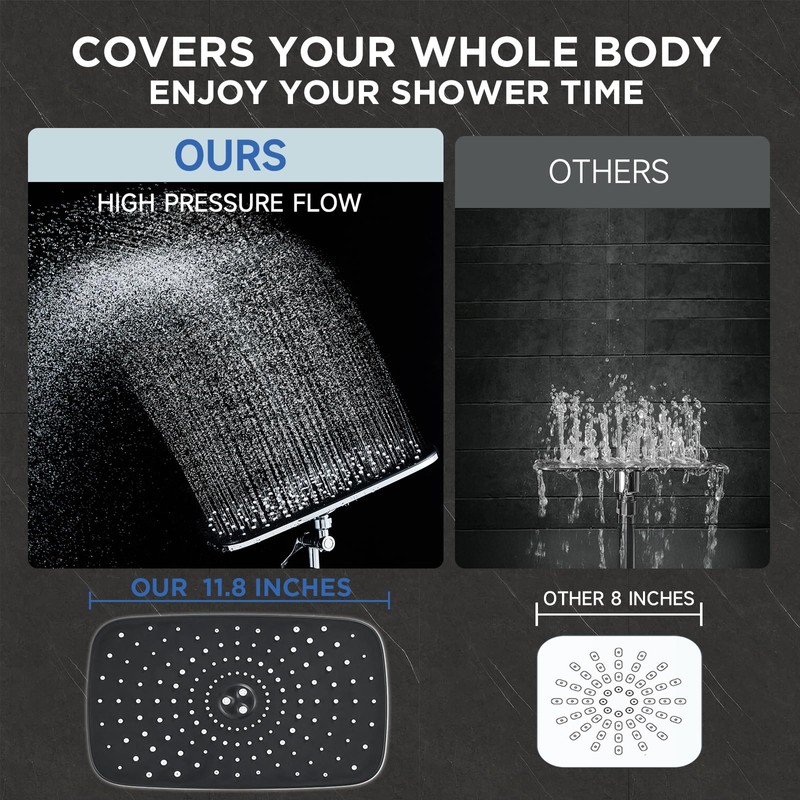 - Wide Coverage Style. Our large 11.8 inch wide shower head allows for full body water coverage for your most satisfying shower yet. Enjoy the feeling of true luxury with our generously sized design that never leaves you in the cold.