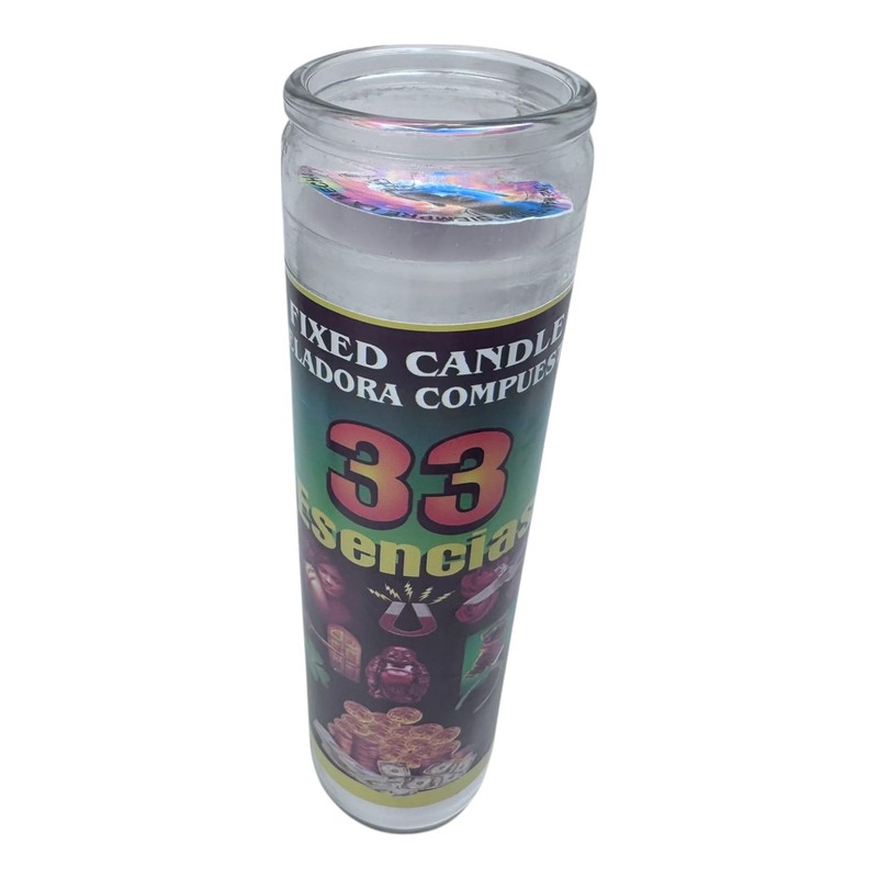 Veladora Esotérica Mexicana: "33 esencias" 14 oz, Blanca, Sin Aroma