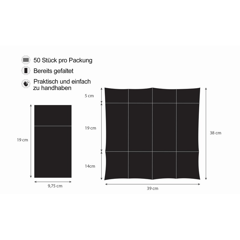 - Size – The size of the napkin is 39 x 38 cm, the folded napkin is approx. 8 x 19 cm and has a cutlery pocket. One package contains 50 napkins.