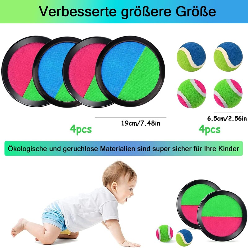 - Team fun for young and old: Velcro ball game with 4 catching discs and 4 balls, this Velcro ball game is ideal for teams. Whether in the garden, park or on the beach - children and adults can play together and strengthen social skills - for teenagers it can reduce their dependence on electronic devices such as mobile phones and tablets, for families it promotes parent-child relationship. A perfect Velcro game throwing game for children that makes family moments unforgettable