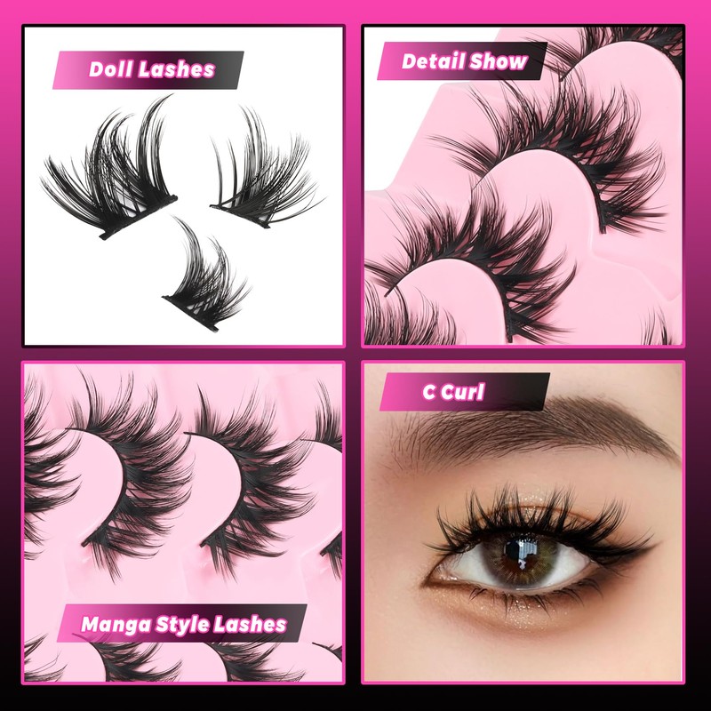 Veleasha Lashes Kit Manga Lashes Soft Eyelashes Wispy Eye Lash DIY Lash Crisscross with Eyelash Glue & Tweezers Multiple Wear Ways Soft Cotton Band 100% Handmade 7 Pairs Pack (Mermaid Kit)