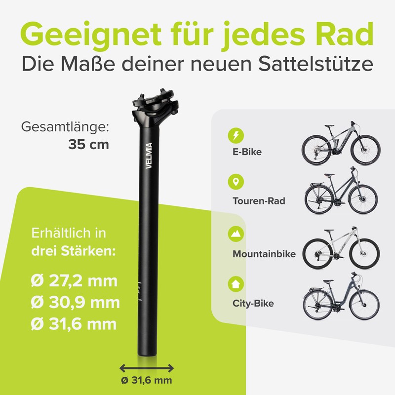 • For any bicycle: seat post 31 6 mm, spring seat post 27.2 and seat post 30.4 suitable for e-bikes, MTBs, trekking bikes and more