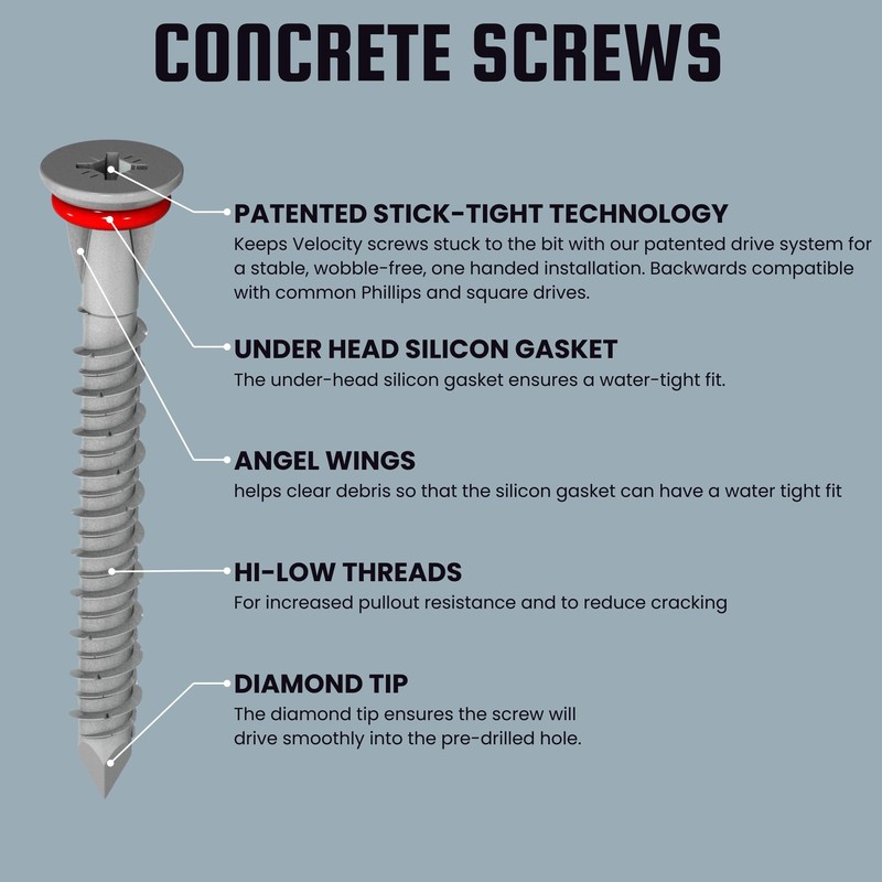 - REDSEAL MOISTURE BARRIER: Velocity Concrete Screws are designed with Patented RedSeal Technology, complete with patented Angel Wings for the ultimate moisture barrier system. This creates an impenetrable barrier and ensures a tight seal, making these the ideal exterior screws for your outdoor needs, from installing hose reels to flag poles.