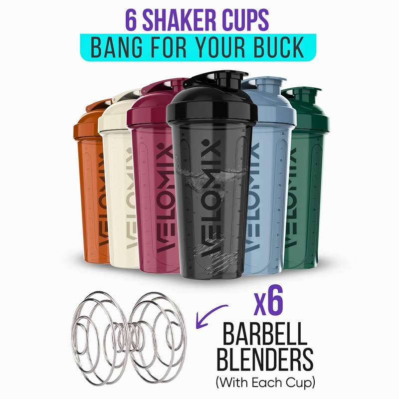 VELOMIX VELOMIX -6 PACK- Shaker Cups for Protein Shakes 28 oz - 6x Wire Whisk | Leak Proof Protein Shaker Bottle for Protein Shakes, Shaker Bottle Pack for Pre & Post Workout, Shaker Cup