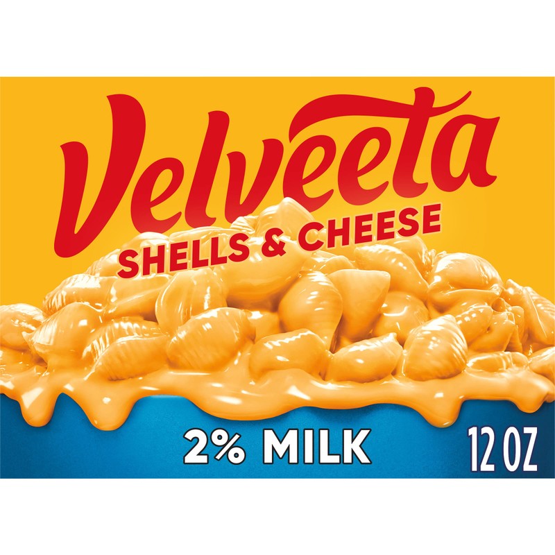Velveeta Shells and Cheese Made With 2% Milk Cheese gives you all the goodness of liquid gold, but with half the fat of regular shells and cheese. Smooth, creamy and undeniably Velveeta, the combination of shells and creamy cheese sauce is an instant family favorite. Each box of mac and cheese includes shell pasta and cheese sauce, so you have everything you need to serve the side dish your family loves. The delicious boxed dinner features real cheese from 2% milk in every bite. To prepare, boil the pasta until tender, drain, and stir in the cheese sauce for an easy dinner that's ready in 10 minutes. Each 12 ounce box of mac and cheese meal makes about 3 servings. Add a little liquid gold to all your meals with Velveeta mac and cheese.