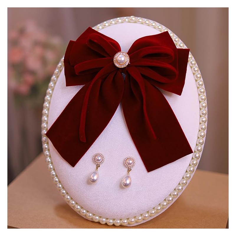 Velvet Bow Hair Clip Set, Red, with Pearl Embellishments (2pcs Earring Needle(1))