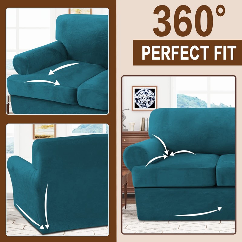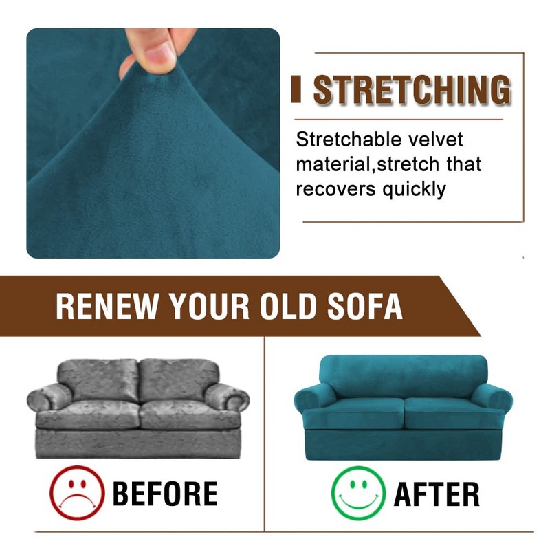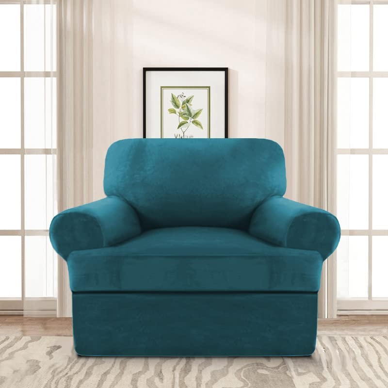 Velvet T Cushion Sofa Slipcover 2 Pieces Sofa Covers for T Cushion Sofa Soft Couch Cover Sofa Slip Covers Furniture Protector with 1 Individual T Cushion Shape Seat (Deep Teal, Chair)