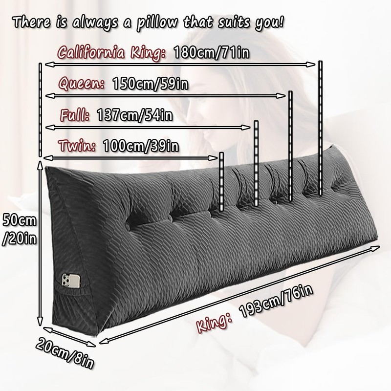 • Multiple sizes: We have a total of 5 sizes, and there is always one that suits you!This large headboard pillows provides excellent back,lumber and neck support while sitting up in bed, reading, watching TV,browsing phone, surfing tablet, playing video games and so on. The large headboard backrest support pillow fits perfectly to your mattress.