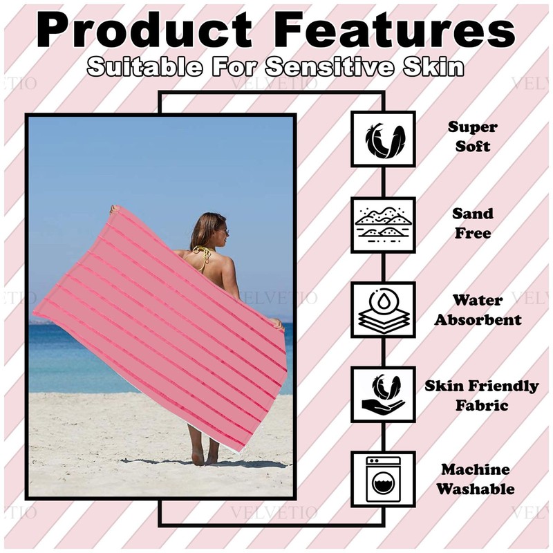 VELVETIO Luxury Sand Free Beach Towels, Extra Large Pin Stripe Towel for Adults, Lightweight Quick Dry Lining Towel Ideal for Swimming - 100 x 200cm, Pink