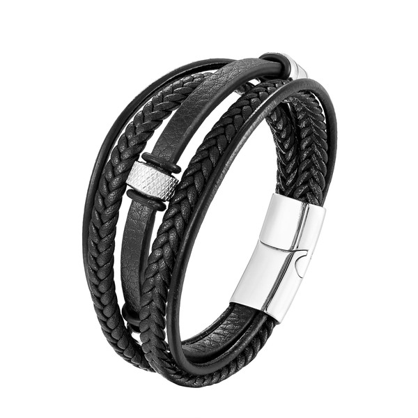 - Material: Woven multi-layer leather strand featuring with stainless steel ornaments and clasp