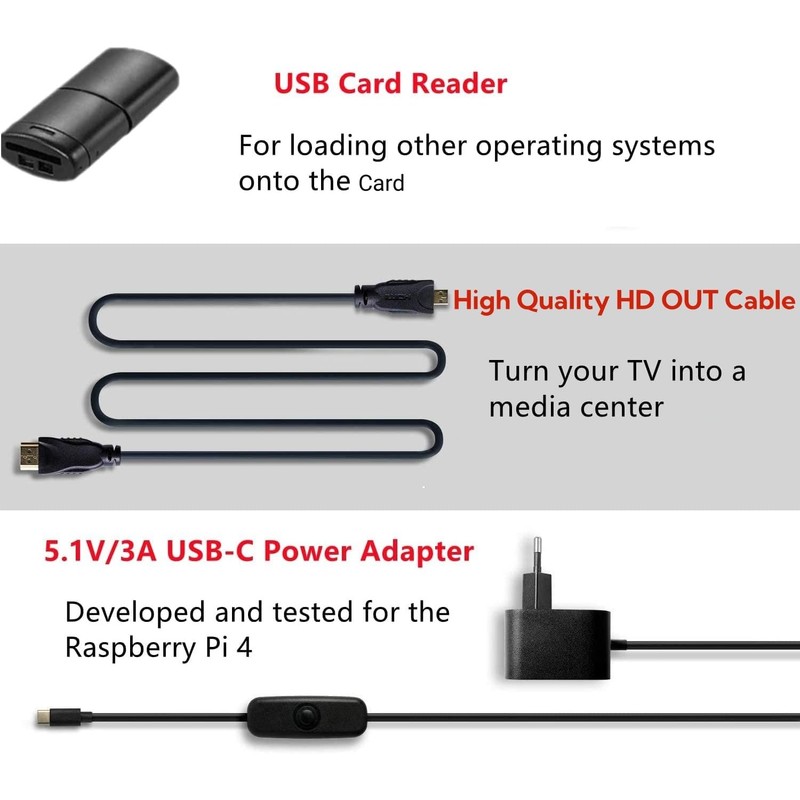 - 【Package Included & Service】1 x Raspberry Pi 4 B board (4GB), 1 x 32GB Card, 1 x Card Reader, 3 x Heatsinks, 1 x ABS Black Cover, 1 x Network Cable, 1 x HD OUT Cable, 1 x Fan ,1 x Power Cable with switch, 1 x screwdriver. The 32GB card is in the package of the Raspberry Pi motherboard. If you have any questions, please feel free to contact us by email.
