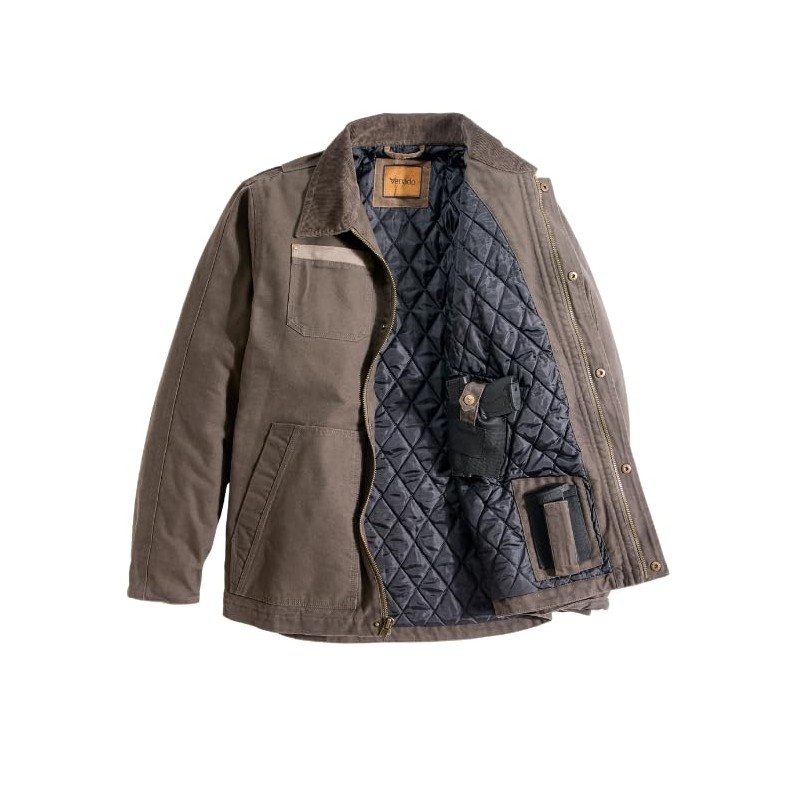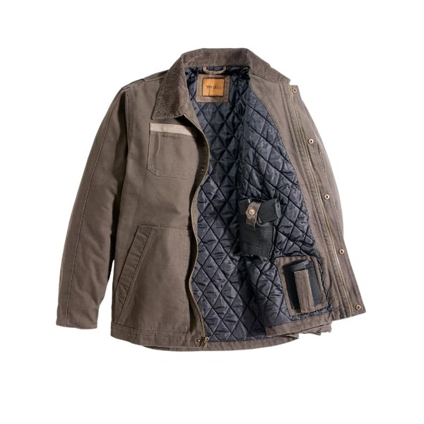 - Workwear Concealed Carry Jacket – This heavyweight, comfortable quilt lined jacket for men features interior pockets for both right and left-handed shooters, so you can keep your handgun or firearm safely concealed and at the ready anywhere you go.