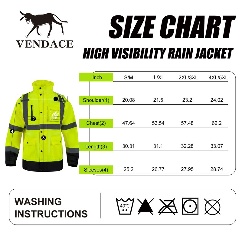 - 【Waterproof and Wind-resistant】VENDACE hi vis rain jacket is made of 300D Oxford Fabric Outer Shell,it features PU coating and sealed seams for enhanced water resistance.Inner is made of breathable mesh fabric,effectively improves comfort and prevents sultry heat.The high visibility rain jacket with zipper and buttons.Can adjust the Cuffs at wrists,prevent rain entering
