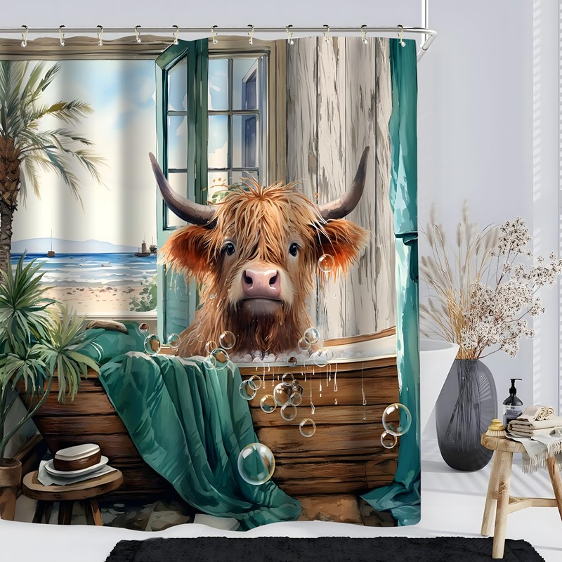 - 【SIZE & MATERIAL】: Thefunny highland cow bathroom decor 60"W by 72"H size to fit standard tubs and showers. It is made of 100% Premium polyester fabric which is waterproof, quick-drying, easy care,durable eco-friendly.