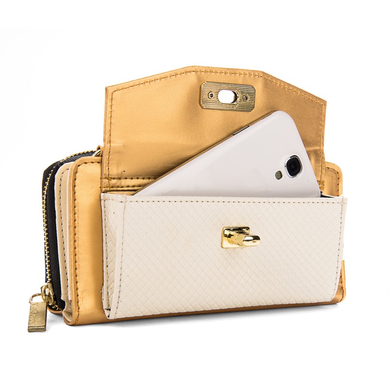 Front smartphone compartment ideal for small and big phones. The compartment has been design with side pleats that helps to keep your phone snuggly in place. Compartment approximate dimensions: 5.87(L) x 3(W) x .5(D) inches. Features a secure gold metal fancy turn lock.