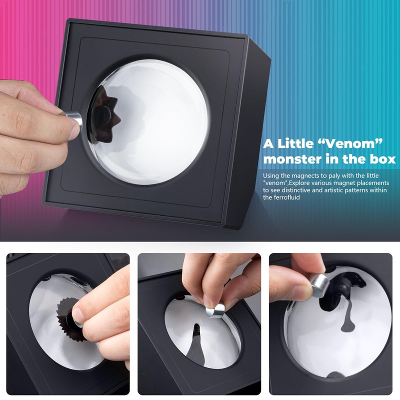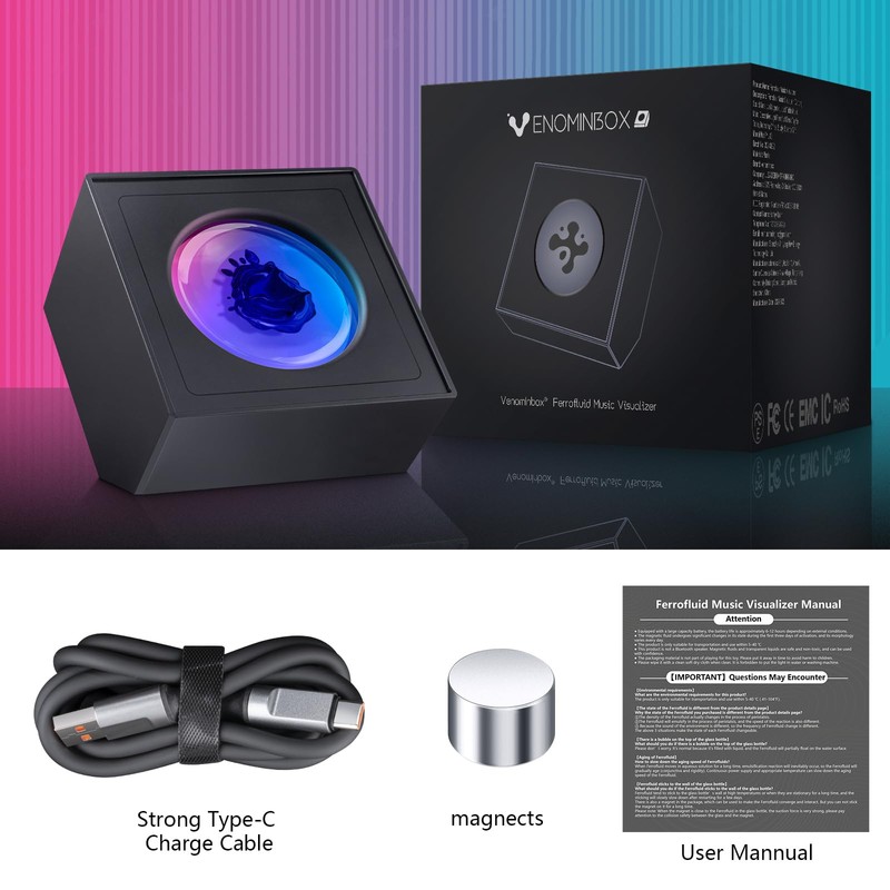 - VenominboxFerrofluid, renowned as the prototype substance for the Marvel movie Venom, inspired this design. Our goal is to make the ferrofluid in the glass bottle move in various patterns to the rhythm of external sounds or music, visualizing the sound and music to create a unique and captivating visual experience.