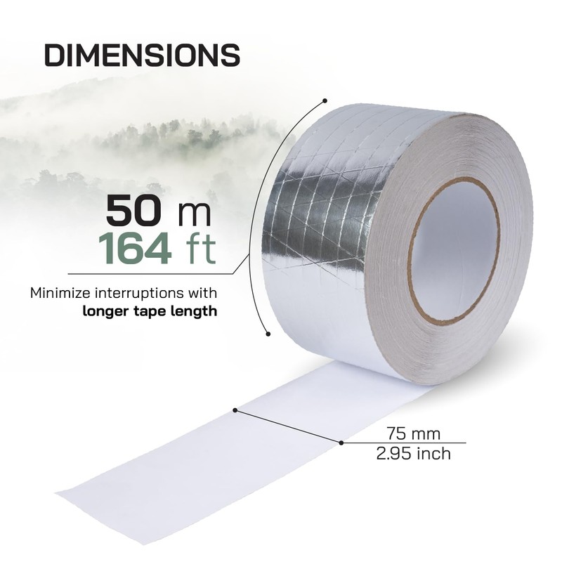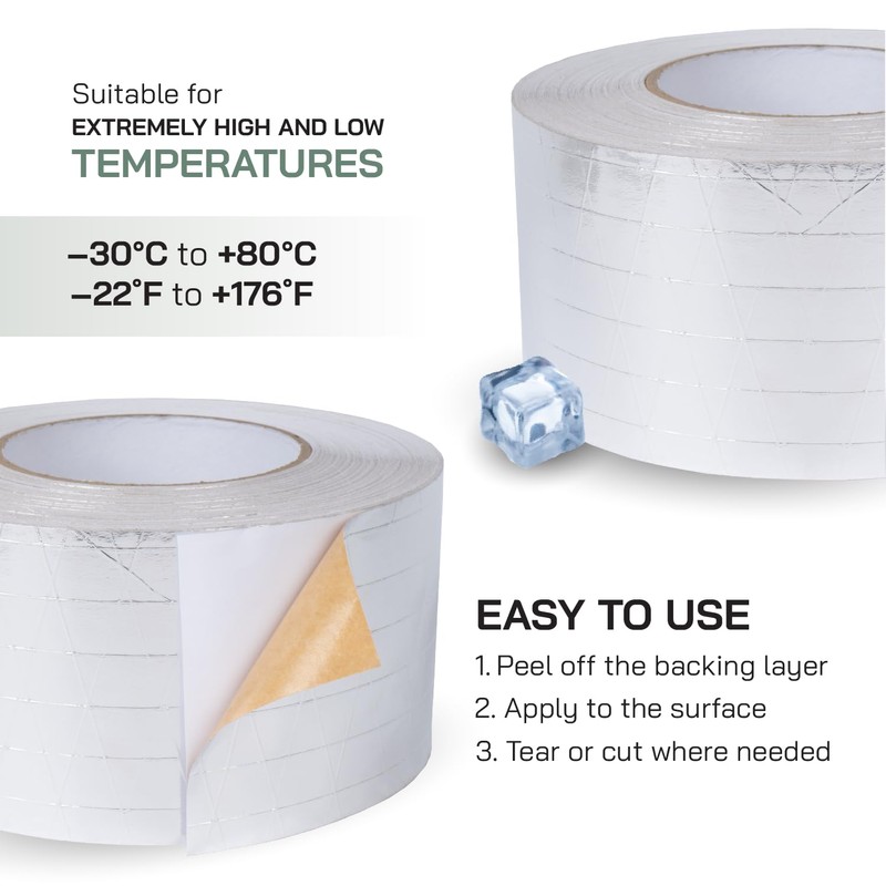 - Durable Material: Made from 0.1mm thick reinforced aluminum sealing foil with a sleek metal finish and integrated diamond-weave glass fibre mesh for improved tearing and stretchability. Temperature resistance ˚F -86 to +176. Application temp. ˚C +10 to +40 / °F +50 to +104