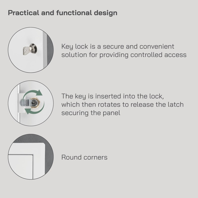 - The unique style of handle and lock system allows easy access. Practical design of hinges gives 100% use of open space.